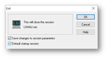 Hit the “X” to close the session. Please ensure that you click on ‘Save changes to session parameters’ and’ Default start up session’ > Click OK